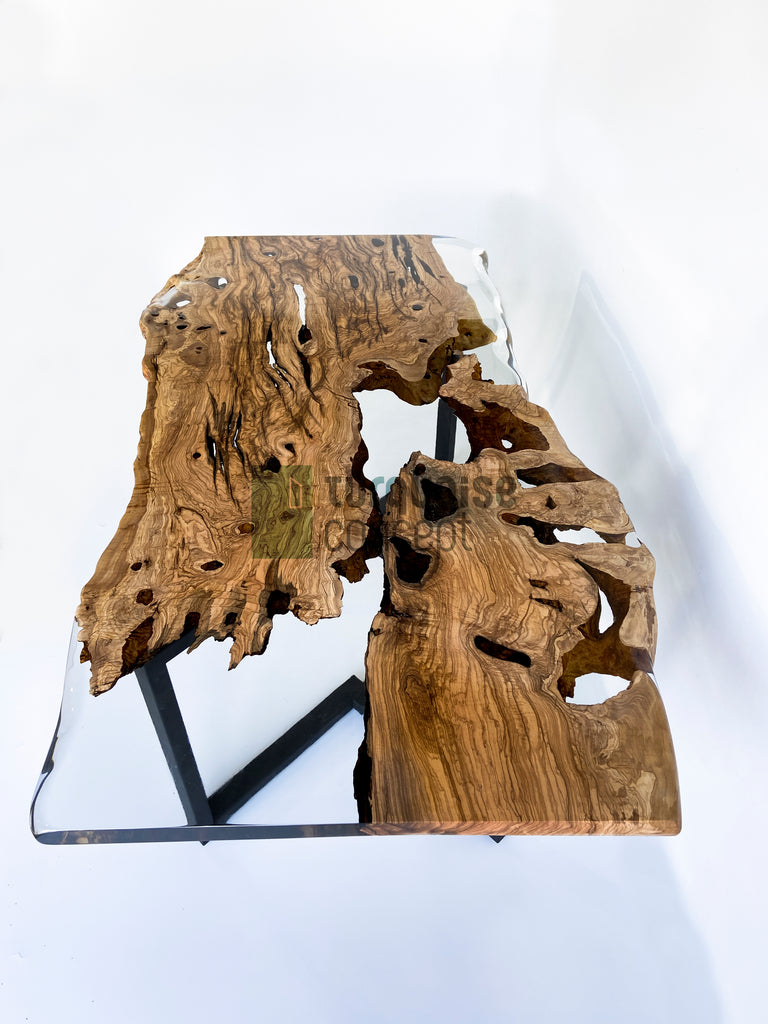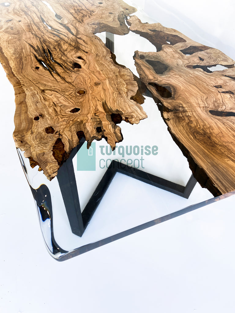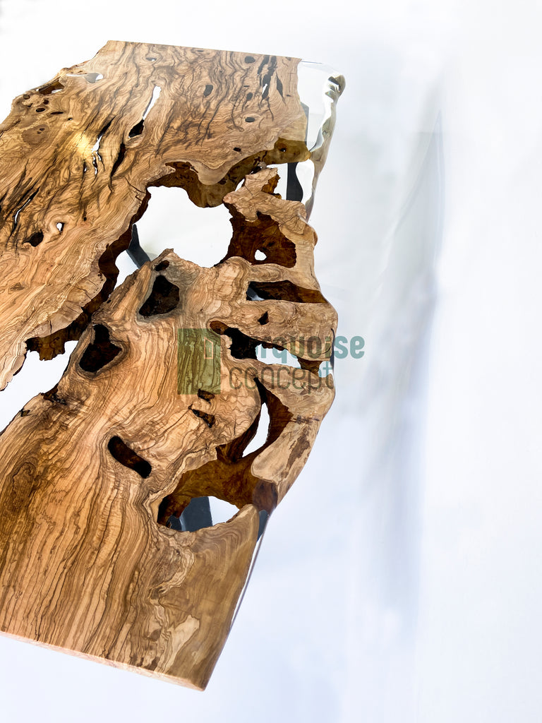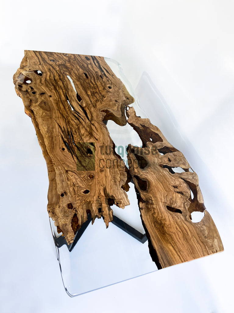 Brushed Live Edge Design, 450 yrs old Olive Tree Logs, Transparent Clear Epoxy, Additionally wrapped with scratch-free protection shield.