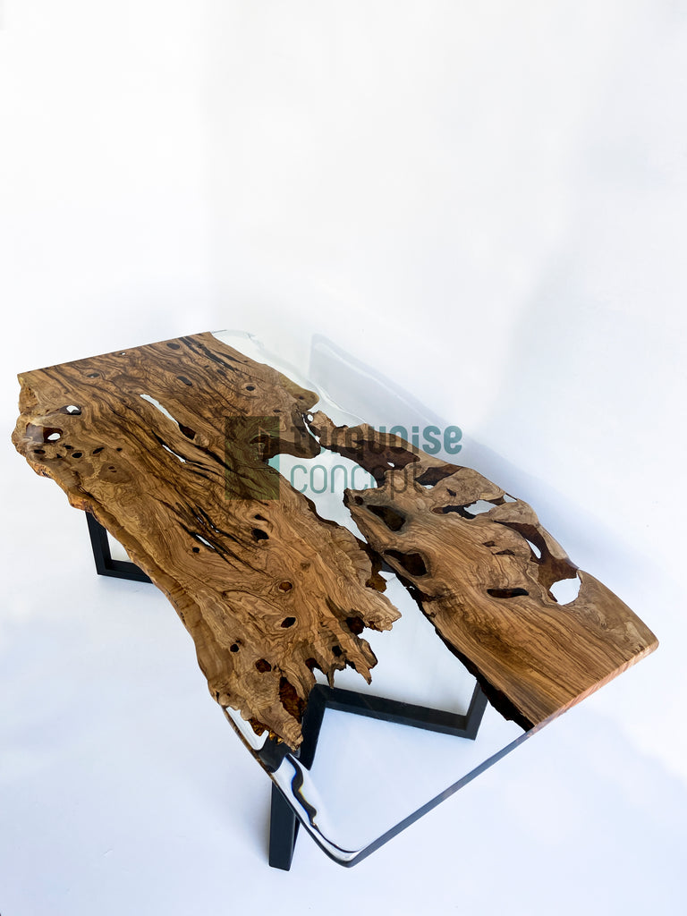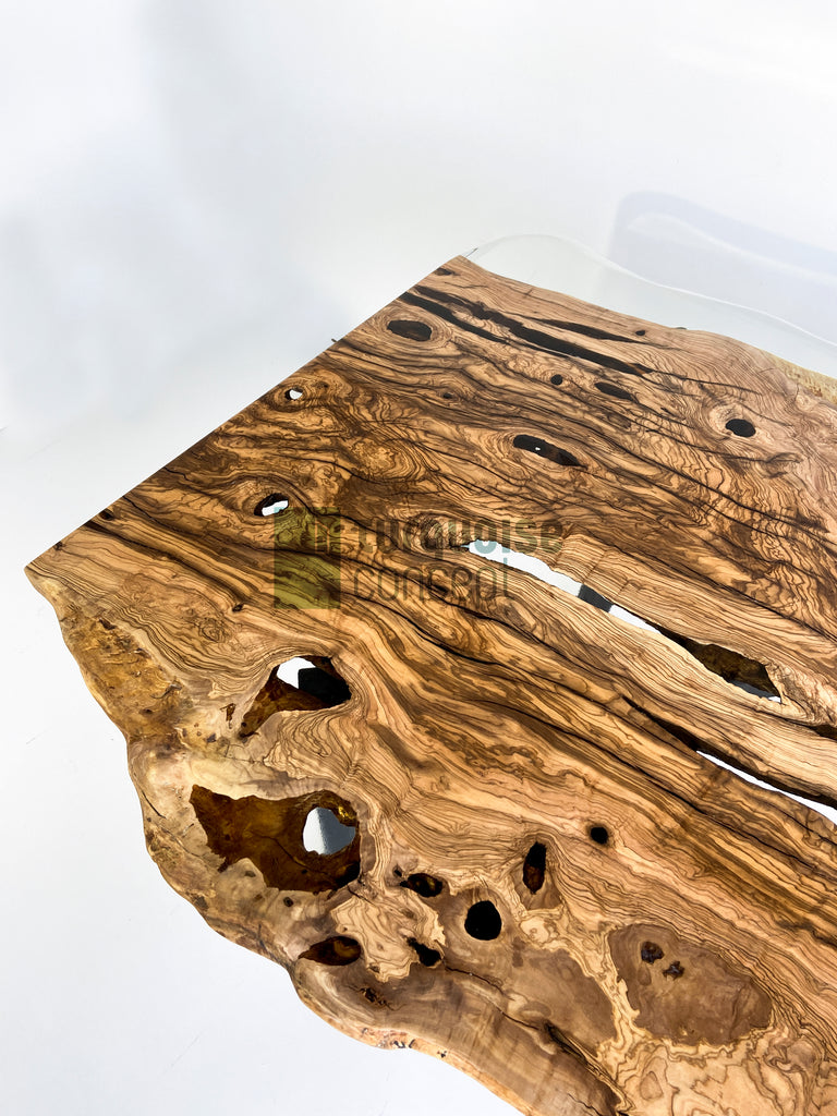 Ligna Dia 3 Clear Resin Dining Table, Live Edge Olive Woods