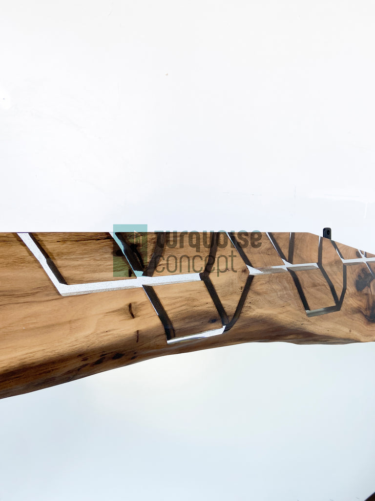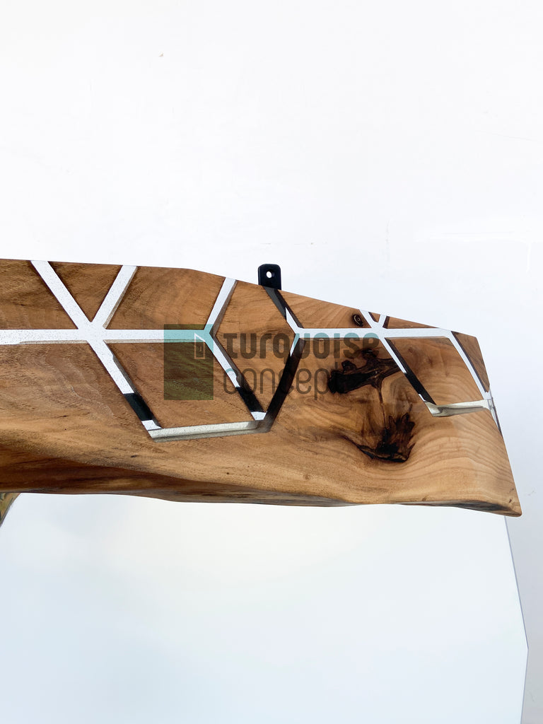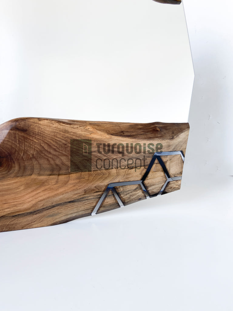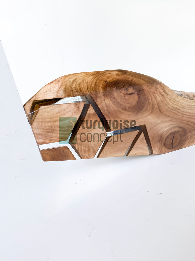 Walnut wood and epoxy resin are used in this design. Hexagonal patterns are carved on the live edge woods, and epoxy resin is cast into the gaps.