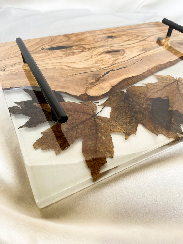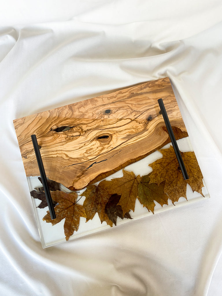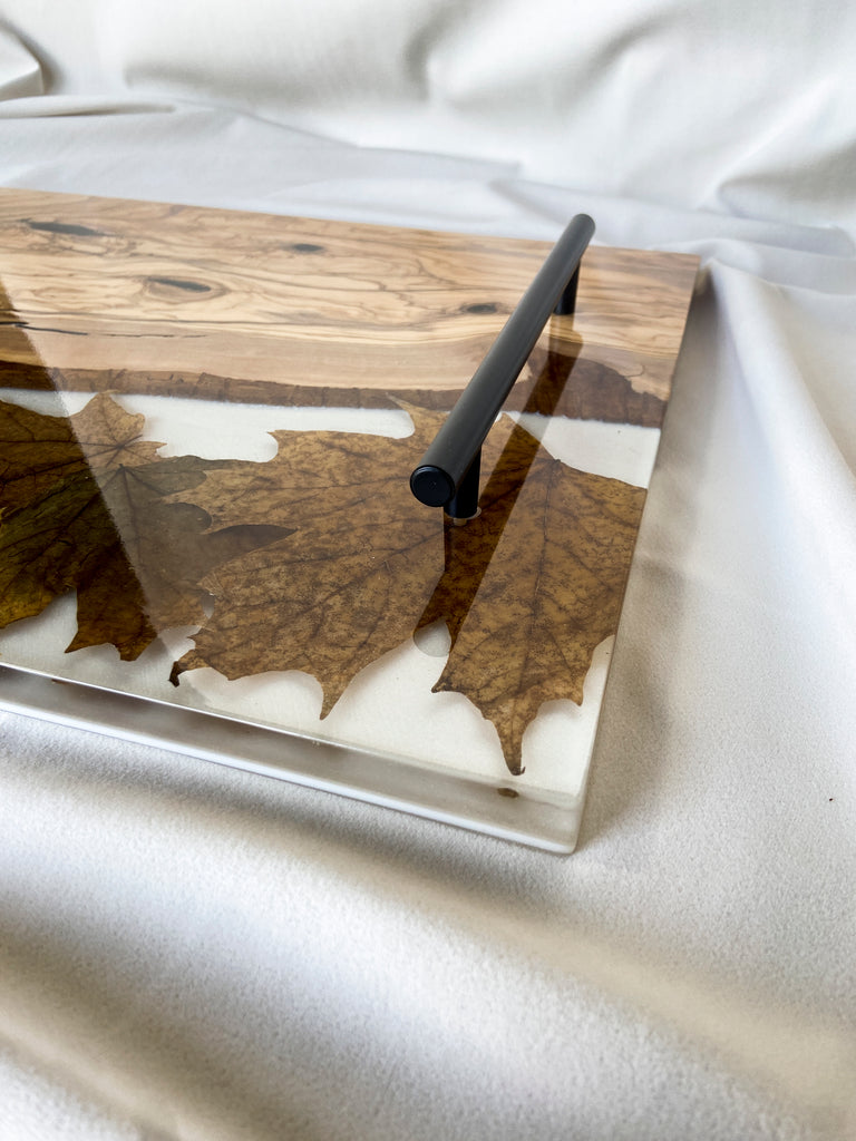 A unique tray design made of transparent epoxy resin and olive wood that we produce using dried maple leaves.