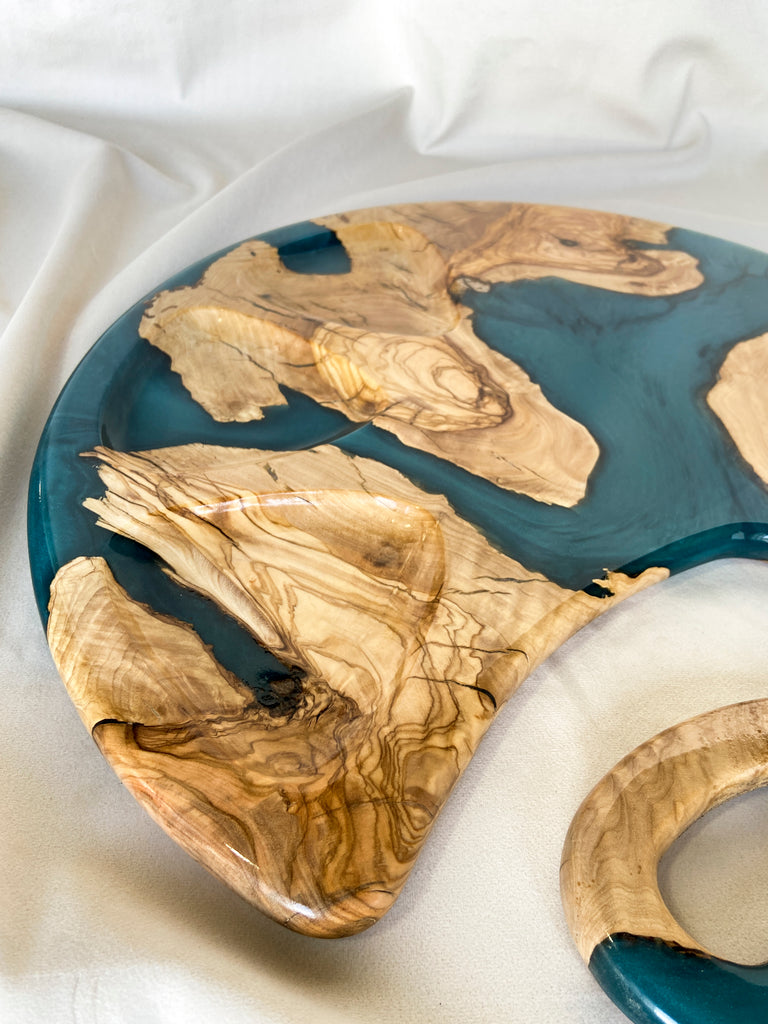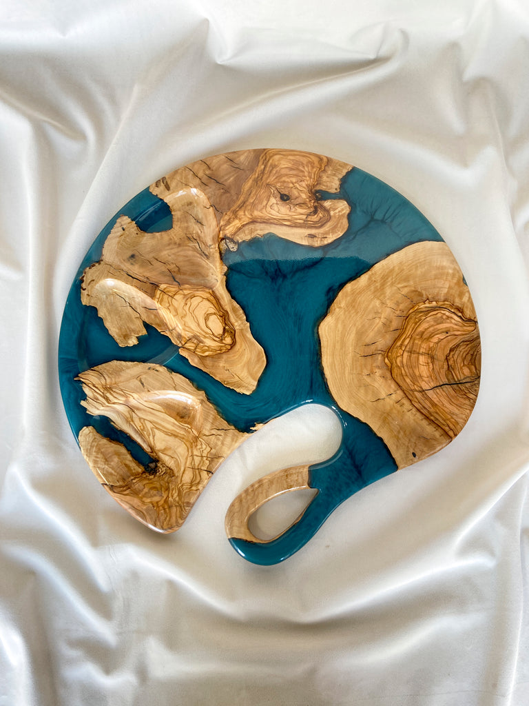We transformed the rare, hard and durable olive wood, which is the most preferred in food presentations thanks to its antibacterial properties, into a fascinating design by combining it with epoxy resin.