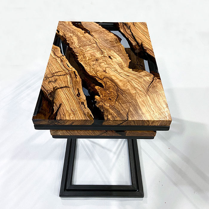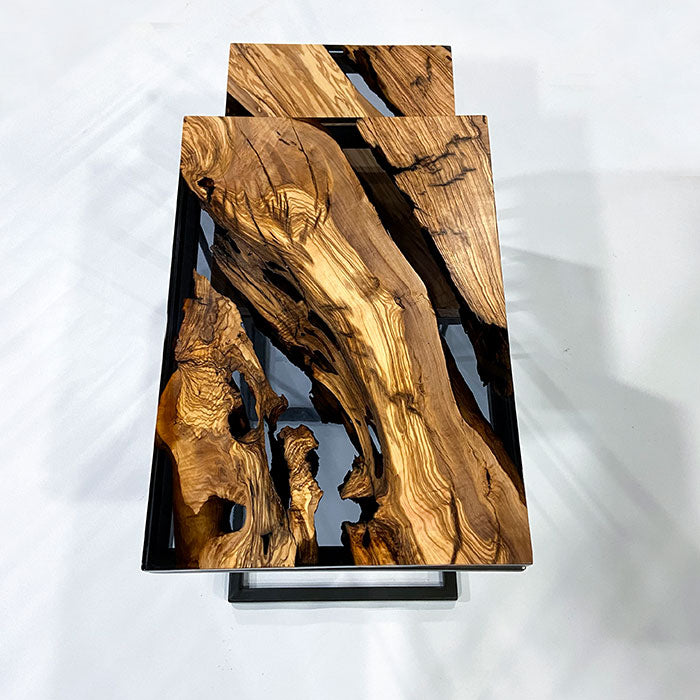 An eye-catching coffee table design with rare olive woods and unique epoxy craftsmanship.