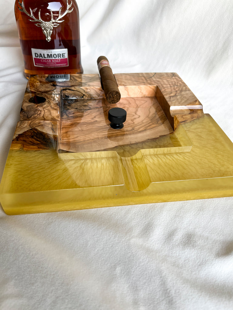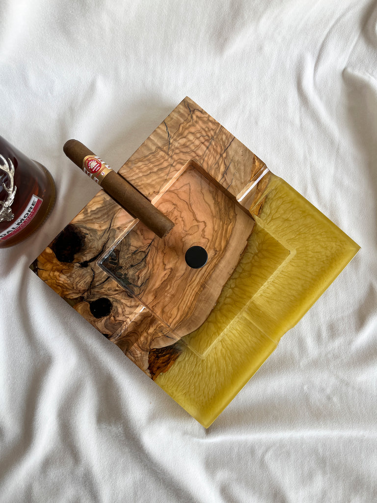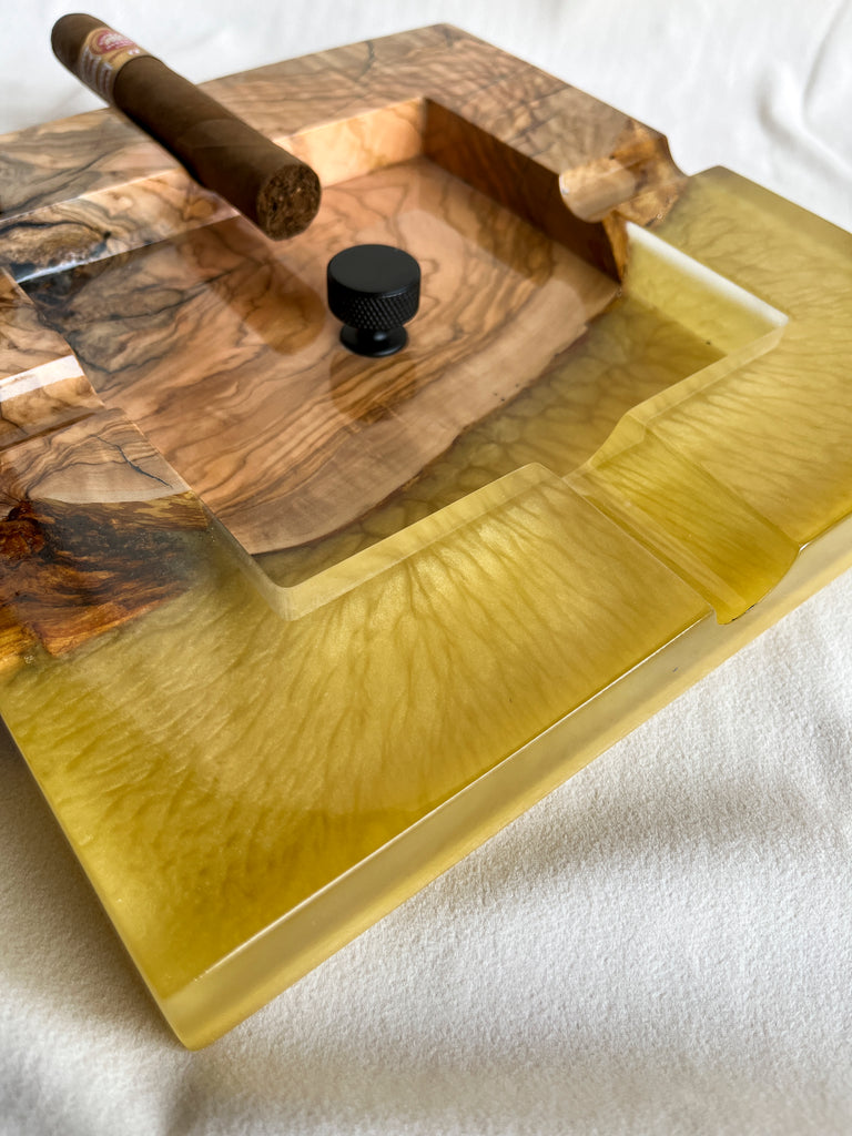 Cigar Ashtray -Olive Wood and Metallic Yellow Epoxy Resin