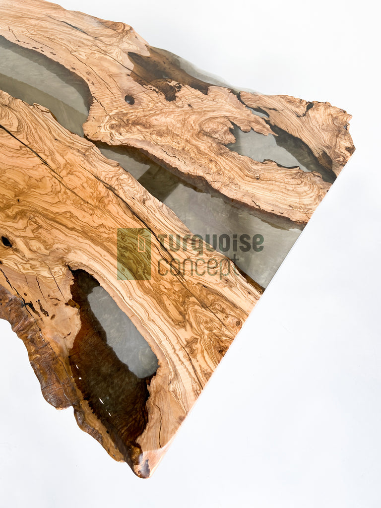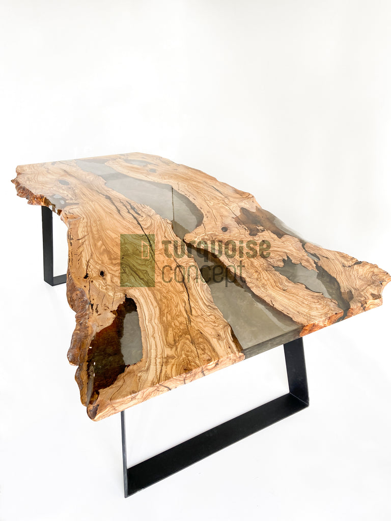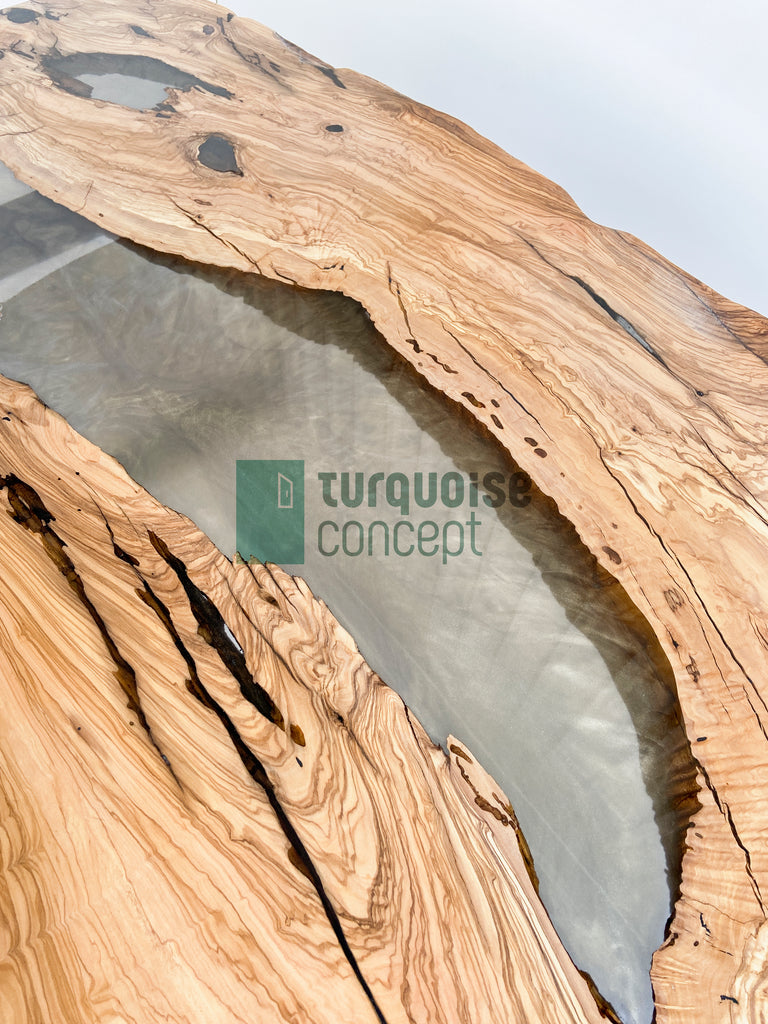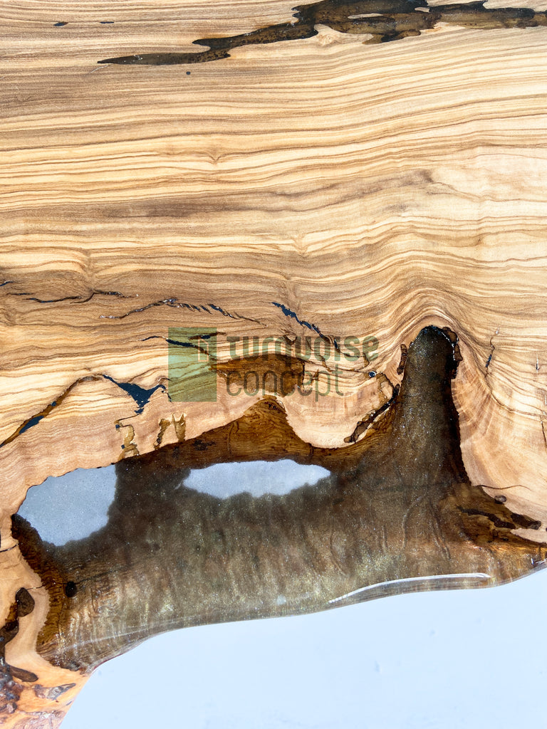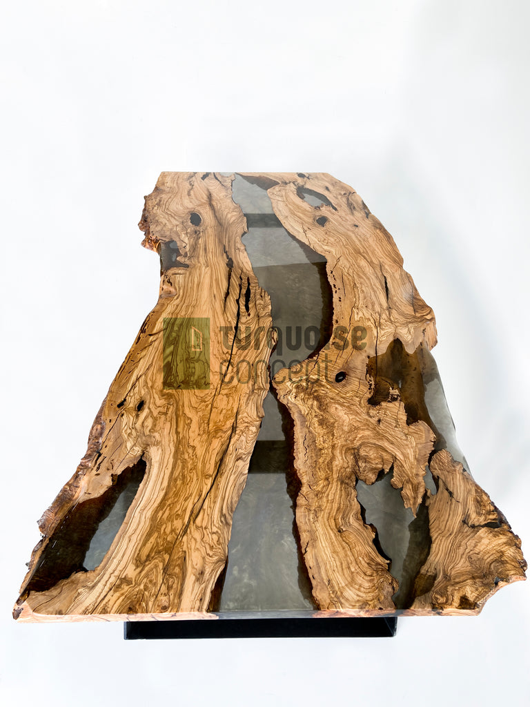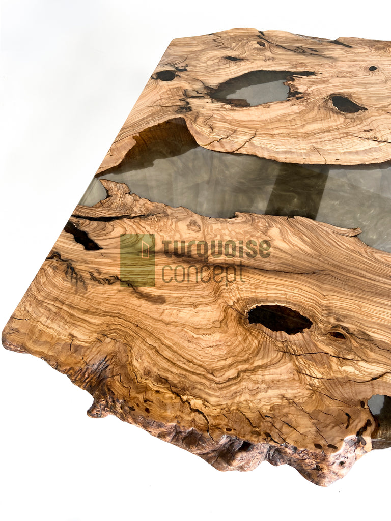 Brushed Live Edge Design, 350 yrs old Olive Tree Logs, Semi-Transparent Gray Epoxy with Gold Coloured Pigments.