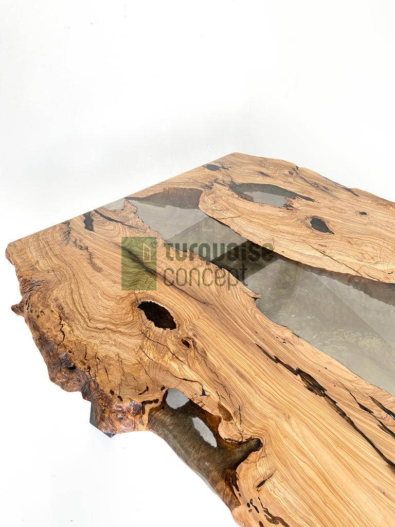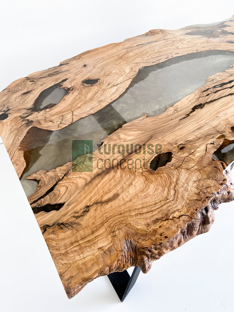 Rare olive woods slabs, which have witnessed history, combine with epoxy resin, which has quickly taken its place in luxury interior decoration, and turn into a unique dining table design.